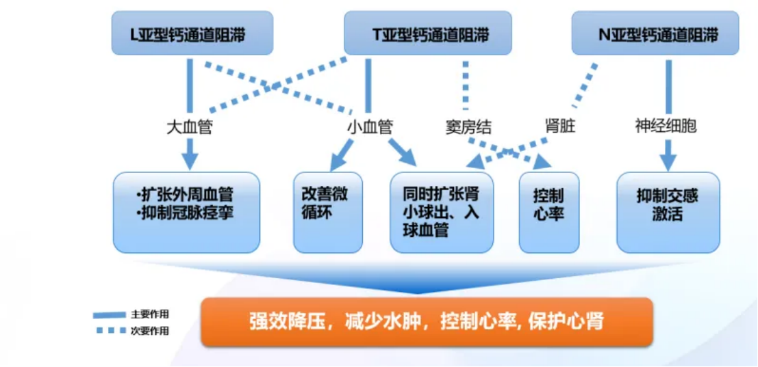 ① L型通道舒张血管:主管血管平滑肌,舒张血管达到降压、抗心绞痛的作用。